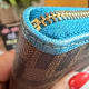 We have a nice shade of turquoise mixed in with the classic logo print on this full sized zippy. It does show some corner wear so please do take the time to look at photos closely in case this might bother you. Photos are zoomed in so it’s worse than it actually looks in real life but it’s there so bear this in mind. Overall this wallet is charming and is still in wonderful condition and will be a great spring/summer wallet!